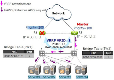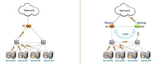 As shown in the figure on the right, when R1 is down through gateway redundancy, it shows an auto-failover through R2. (To Avoid Single Point of Failure) No service disconnect VRRP is standard protocol.